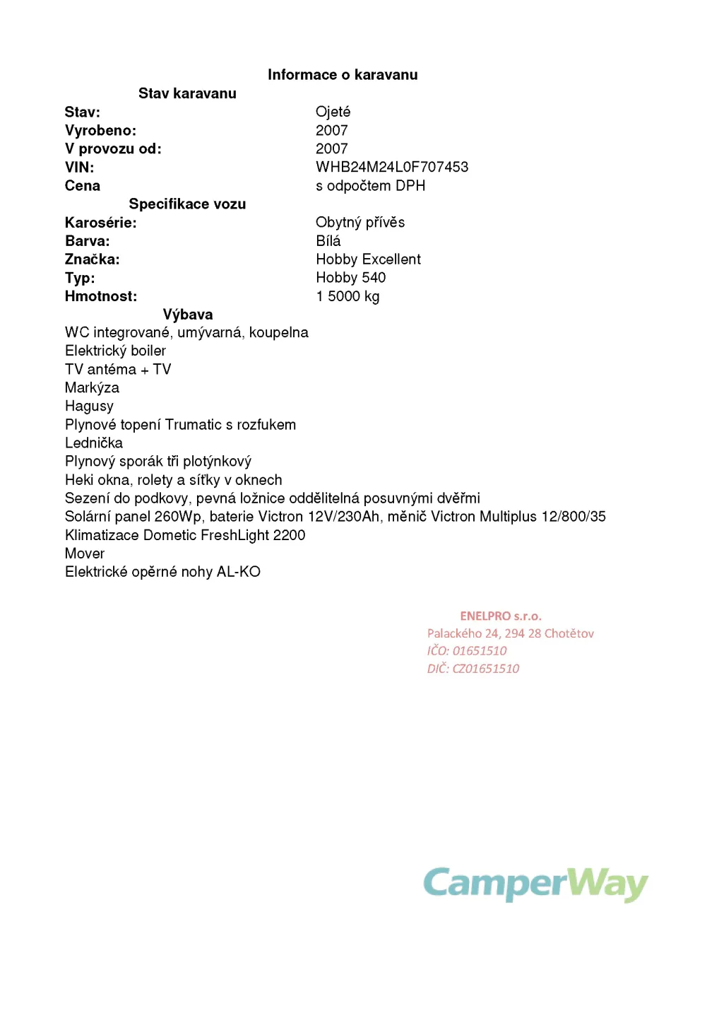 Nabízím k prodeji karavan Hobby 540 Excellent